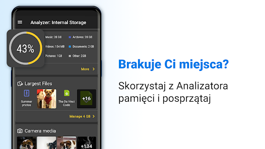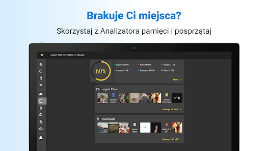 Najnowszy eksplorator plików w aplikacji File Commander w pełni wykorzystuje możliwości Android 13 i oferuje ulepszony Analizator pamięci. Wyświetla on szczegółowe informacje o tym, jakie pliki zajmują miejsce w pamięci Twojego urządzenia i sugeruje, które z nich możesz usunąć lub przenieść, aby szybko zwolnić miejsce w pamięci wewnętrznej lub zewnętrznej.