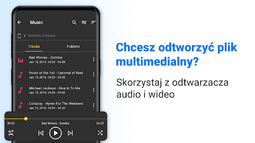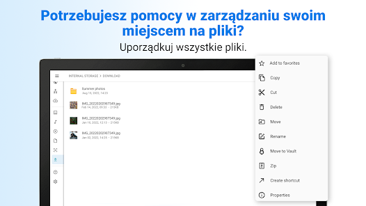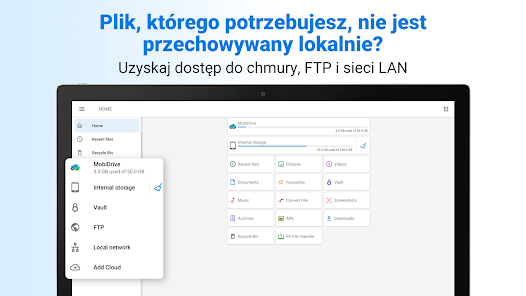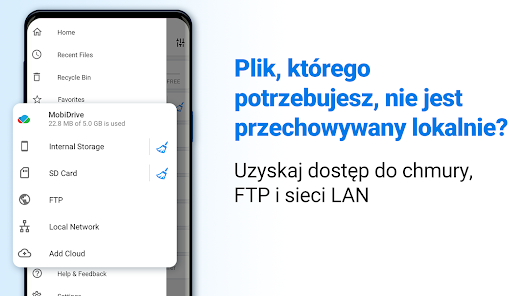 File Commander to zaawansowany menedżer plików, który pozwoli Ci zarządzać wszystkimi plikami na Twoim urządzeniu Android, w pamięci w chmurze czy lokalizacji sieciowej przy użyciu przejrzystego, intuicyjnego interfejsu. Możesz oddzielnie zarządzać bibliotekami obrazów, muzyki, nagrań, dokumentów, a także zmieniać nazwę plików, usuwać je, przenosić, zipować, konwertować i wysyłać – a wszystko to w zaledwie kilka kliknięć.
